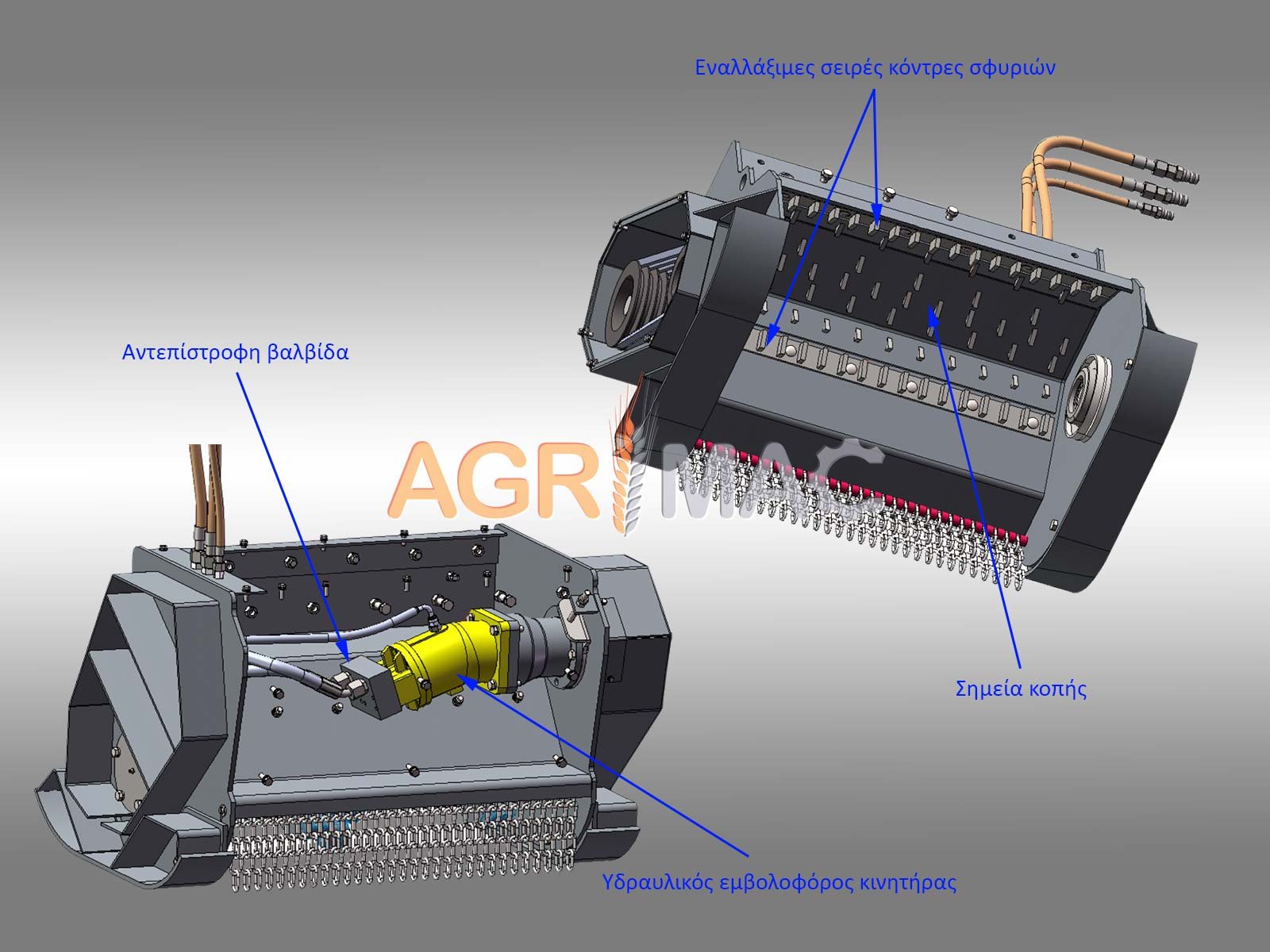 - Υδραυλική κεφαλή δασικού καταστροφέα υπερβαρέως τύπου για εκσκαφέα με σκάφος 8mm, πλαινά 10mm και στροφείο 168x16mm.