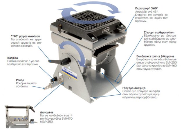 - ο σύστημα σταθεροποίησης πολλαπλών χρήσεων SVN460 περιλαμβάνει το σύστημα σταθεροποίησης κενού αέρος SVN250 τοποθετημένο σε μία περιστρεφόμενη βάση 360°, η οποία έχει την δυνατότητα να γείρει έως 45° μοίρες