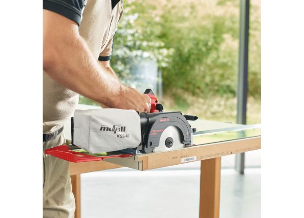 - Το νεωτεριστικό του στοιχείο, είναι μία μοναδική ράγα, η οποία όχι μόνο οδηγεί το φορητό δισκοπρίονο αλλά επίσης ενσωματώνεται σ'αυτό, ώστε να αποτελέσει ενιαίο εργαλείο: το σύστημα σοκοριάσματος KSS40/18V