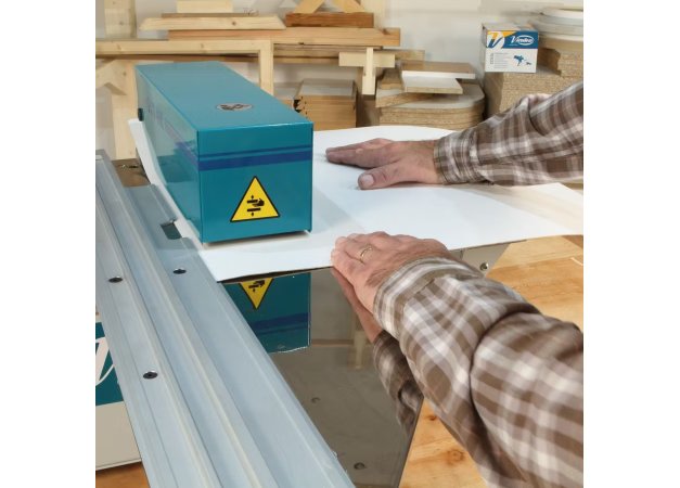 - Εφοδιασμένο με τροχοειδείς αποστάτες, ειδικά για φορμάικα. Εφοδιάζεται επίσης με κινούμενο οδηγό κοπής και μετρικό κανόνα για εύκολη ρύθμιση του πλάτους κοπής
