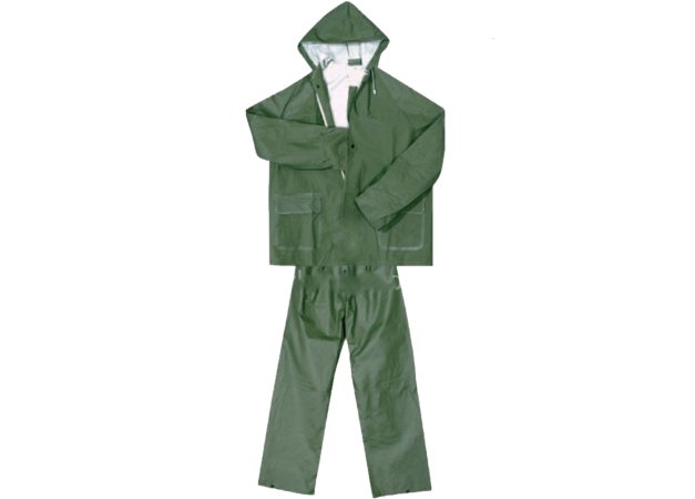 - Αδιάβροχο ραμμένο και συγκολλημένο, διπλής επίστρωσης από PVC / Πολυεστέρα / PVC πάχους 0,30mm.Σταθερή κουκούλα με κορδόνι, κλείσιμο με καλυμμένο φερμουάρ και κουμπιά πίεσης από PVC. Κάπα στην πλάτη με οπές αερισμού όπως και στις μασχάλες.Καρποί με εσωτερικό λάστιχο, 2 μπροστινές τσέπες και παντελόνι με λάστιχο στη μέση.