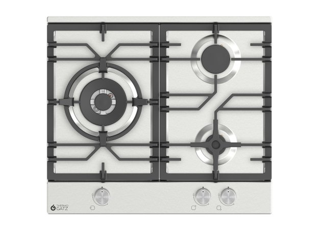 Εντοιχιζόμενη εστία κουζίνας LAMY 300 IX από τον κατασκευαστή Thermogatz, με 3 ζώνες μαγειρέματος. Ο τύπος της είναι υγραερίου, δηλαδή η φλόγα είναι ορατή και το μάτι περιβάλλεται από ένα μεταλλικό πλαίσιο που στηρίζει το σκεύος.