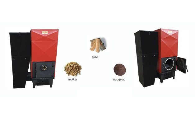 - Η τροφοδοσία του καυσίμου γίνεται από το σιλό μέσω κοχλία που κινείται από κατάλληλα προσαρμοσμένο ηλεκτρομειωτήρα ενώ η παροχή αέρα από τον ανεμιστήρα γίνεται απευθείας στην εστία καύσης. Η λειτουργία του λέβητα στηρίζεται στο φυσικό ελκυσμό με ελεύθερη ροή καυσαερίων ενώ η καύση πραγματοποιείται πάνω στην εστία με τη φλόγα να διαχέεται σε όλο το φλογοθάλαμο. Κατά τη χειροκίνητη τροφοδοσία ξύλου, η καύση πραγματοποιείται πάνω στην αφαιρούμενη σχάρα που διαθέτει ο λέβητας. Όταν επιλεγεί το πετρέλαιο ως καύσιμο η καύση πραγματοποιείται στο θάλαμο καύσης με χρήση καυστήρα. Tα καυσαέρια εξέρχονται μέσω των κατακόρυφων αυλών και καταλήγουν στο συλλέκτη καπναερίων και τελικά στην καμινάδα. Όλα τα τμήματα του λέβητα που έρχονται σε επαφή με φλόγα περιβάλλονται από νερό για να ψύχονται. Η εστία καύσης είναι ανοξείδωτη κυκλικής διατομής με αντοχή σε υψηλές θερμοκρασίες. Ο φυσητήρας διοχετεύει τον κατάλληλο για την καύση αέρα στην εστία καύσης μέσω του περιφερειακών οπών.