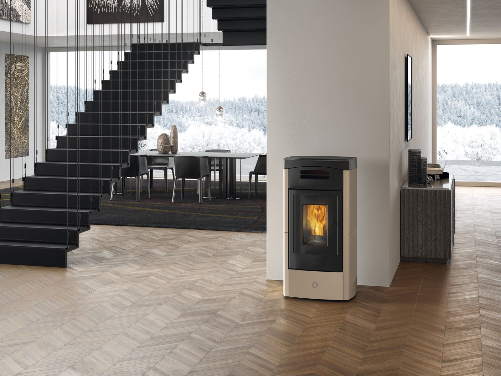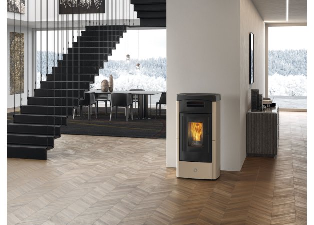 - Αεροστεγής σόμπα πέλλετ με γραμμικό σχεδιασμό με πόρτα από χυτοσίδηρο και κεραμικά πλαϊνά.