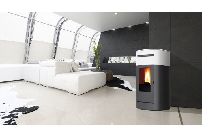- Σόμπα καλοριφέρ pellet που έχει επένδυση από ατσάλι με το πάνω μέρος κεραμικό ή από φυσική πέτρα και εστία από ατσάλι.