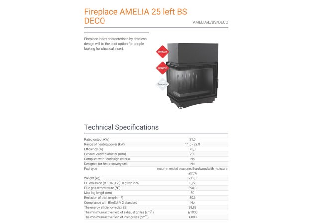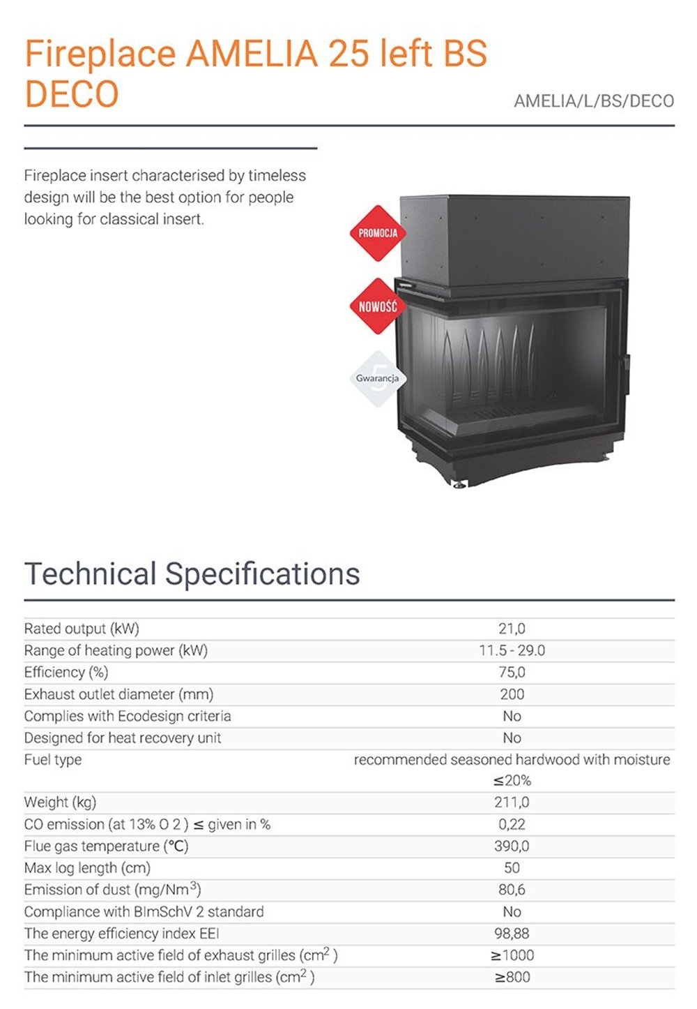 Kratki Amelia L BS Deco Ενεργειακό Τζάκι Ξύλου 21kW Αριστερή Γωνία με Ανοιγόμενη Πόρτα