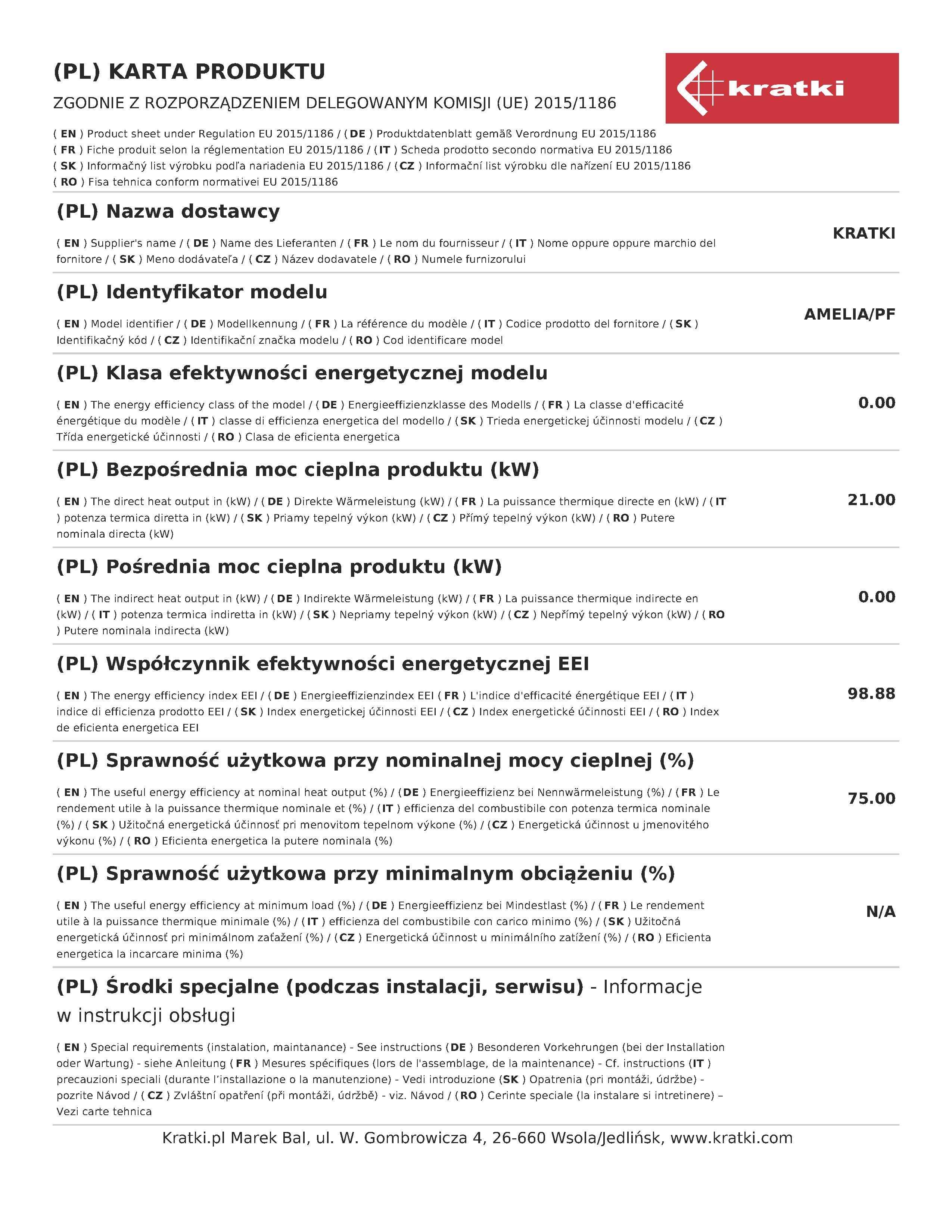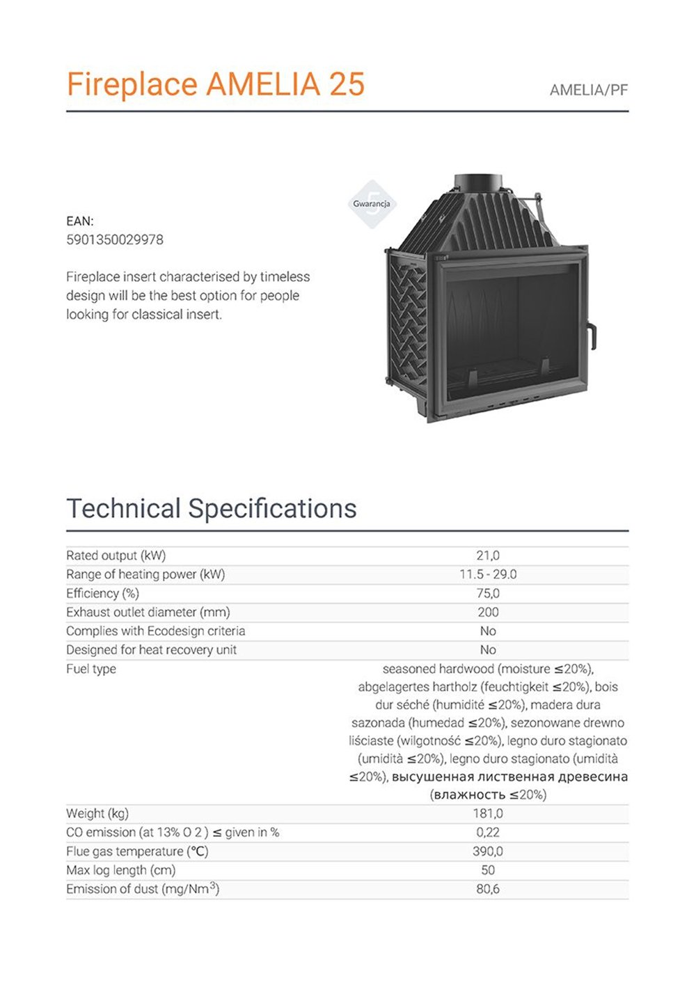 Kratki Amelia PF Ενεργειακό Τζάκι Ξύλου 21kW Ίσιο με Ανοιγόμενη Πόρτα