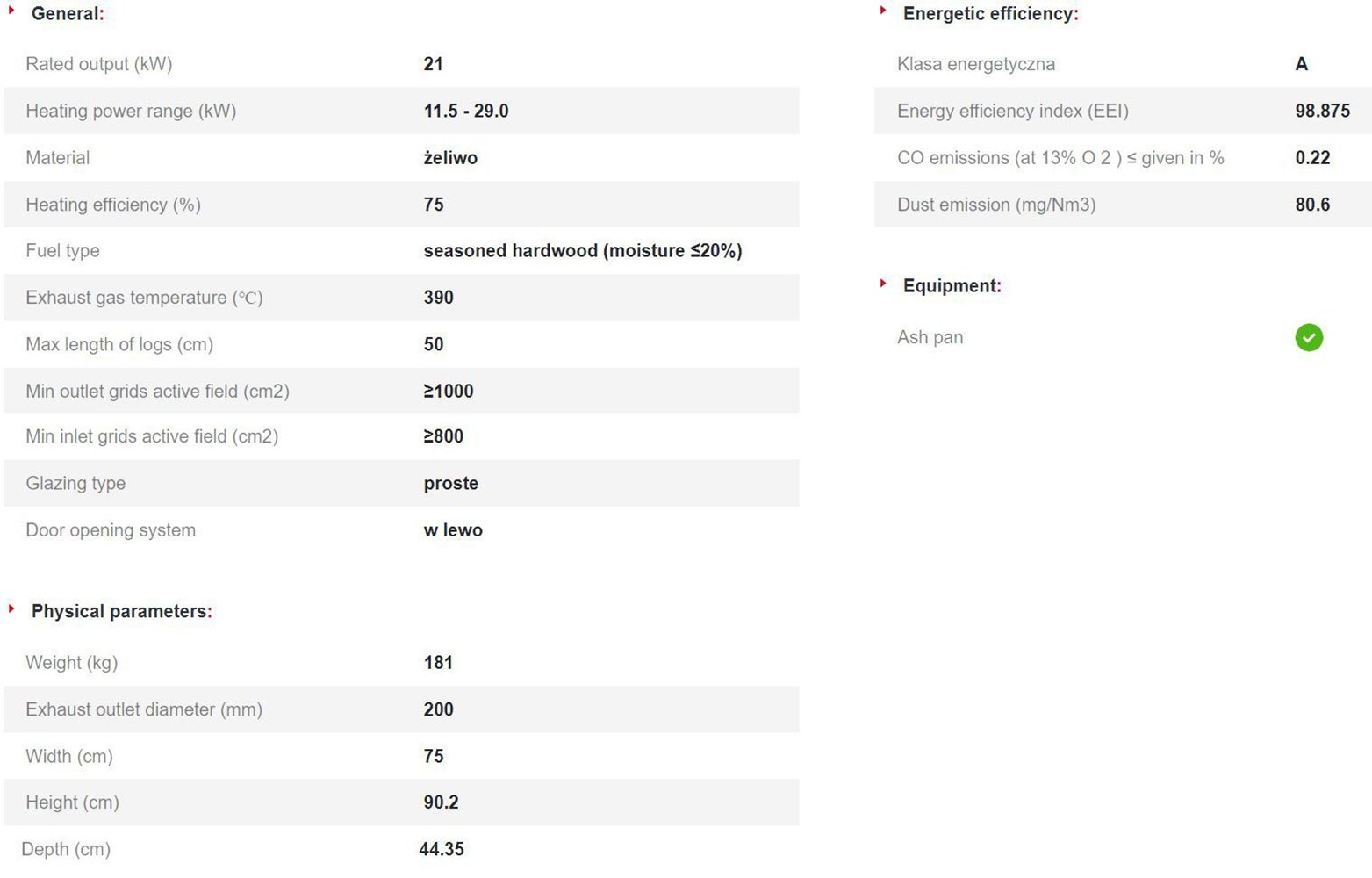 - Συρτάρι στάχτης / τασάκι, όπου συγκεντρώνονται τα υπολείμματα καμένου ξύλου και σχάρα για εύκολη αφαίρεση της τέφρας.