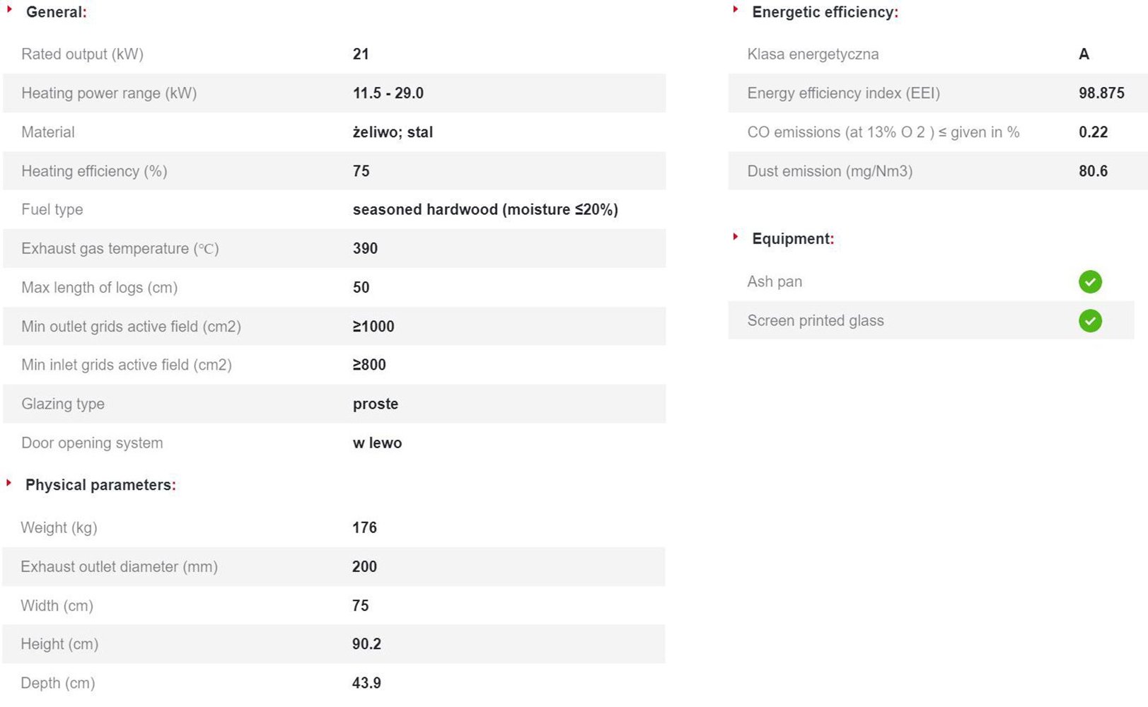 - Συρτάρι στάχτης / τασάκι, όπου συγκεντρώνονται τα υπολείμματα καμένου ξύλου και σχάρα για εύκολη αφαίρεση της τέφρας.