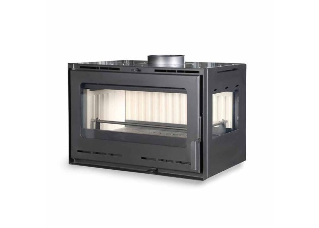 Υψηλης θερμικής απόδοσης, ανοιγόμενη πόρτα με ρυθμιζόμενο αέρα & κλειδί ασφαλείας. Υλικό κατασκευής χάλυβας και πυρόπλακες στον χώρο καύσης. Κεραμικό τζάμι 4mm 750ºC & αεροκουρτίνα. 2 Βεντιλατέρ x160m³/h.