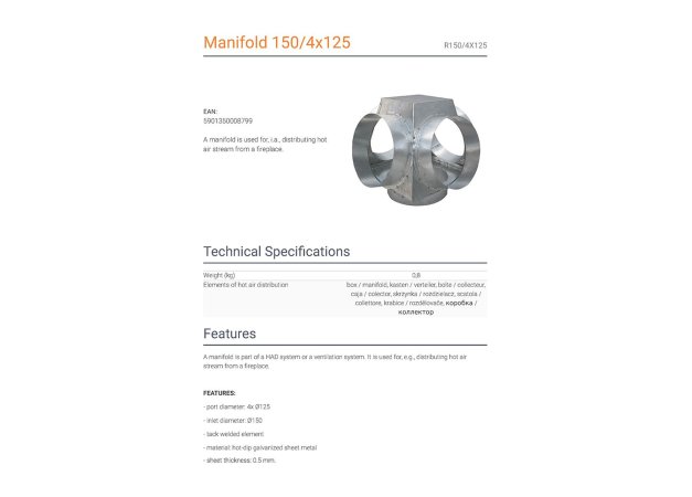 Kratki R150/4X125 Διανομέας Αέρα για Ενεργειακό Τζάκι