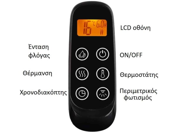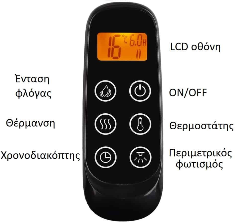 - Περιλαμβάνεται ψηφιακό τηλεχειριστήριο με οθόνη LCD και ενδείξεις θερμοκρασίας, θερμοστάτη, χρονοδιακόπτη (timer) έως 9 ώρες, ρυθμίσεις χρώματος εφέ φλογας, επιλογών χρωμάτων εστίας.