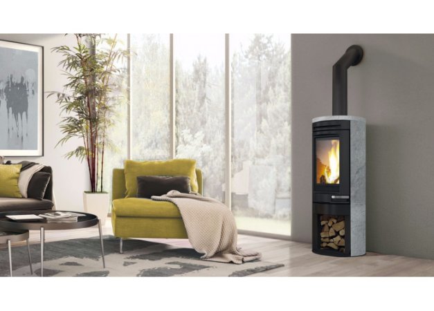 - Σόμπα ξύλου. Άπλετο κάθετο τζάμι που εκθειάζει τη φυσική πορεία της φλόγας.